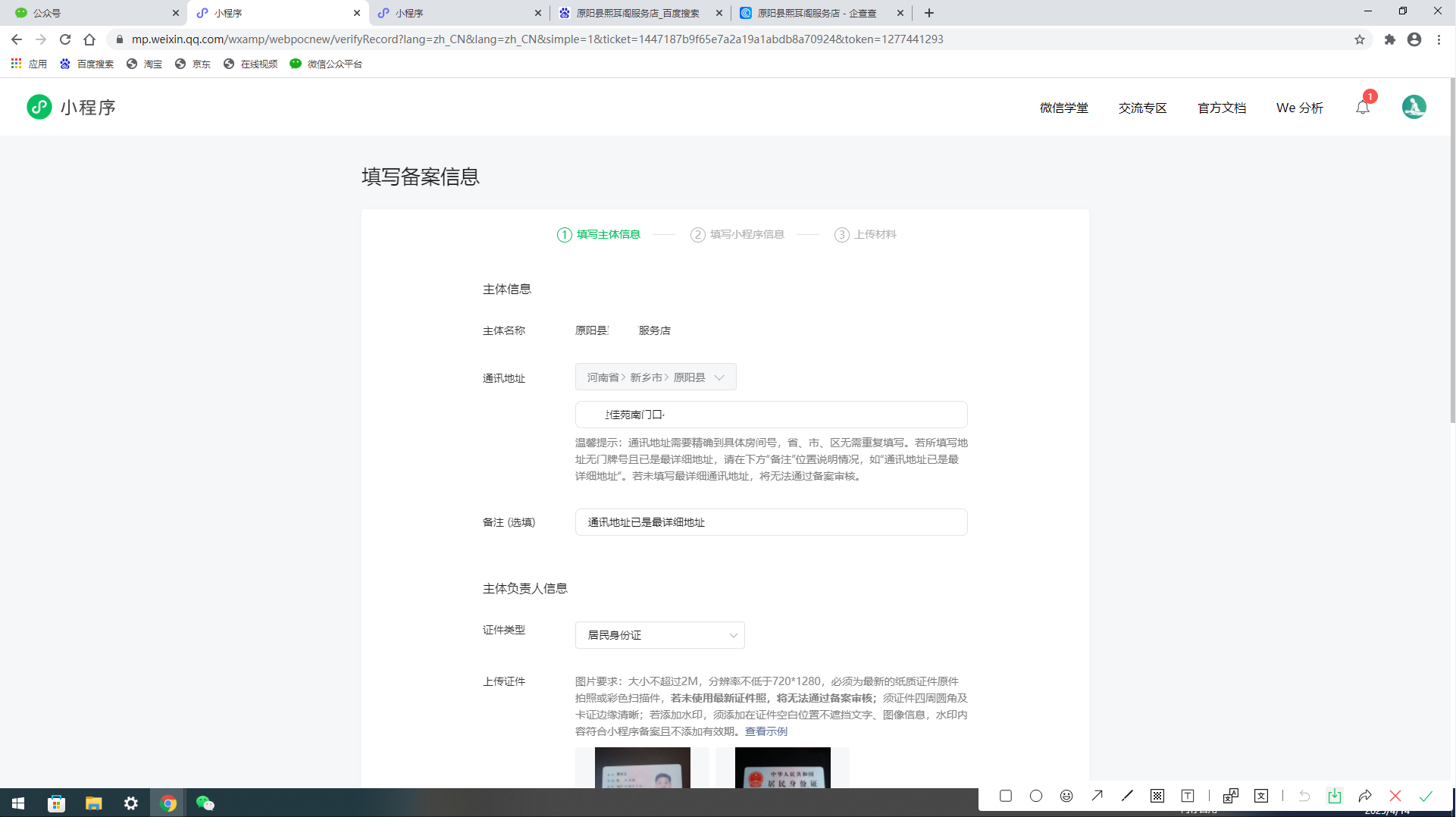 1.填寫主體信息,復(fù)制通訊地址已是最詳細(xì)地址粘貼到備注,主體負(fù)責(zé)人是企業(yè)法人,再要兩個(gè)備用手機(jī)號